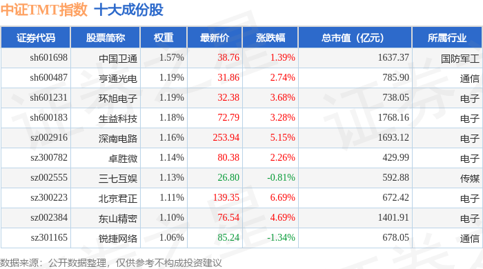 证券之星消息,1月27日,中证TMT(000998)指数报收于3274.11点,涨1.71%,成交3592.3亿元,换手率2.33%。当日该指数成份股中,上涨的有68家,盛科通信以20.0%的涨幅领涨,下跌的有31家,浪潮信息以3.02%的跌幅领跌。