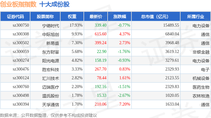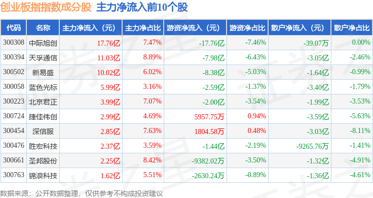 资金流向方面,创业板指(399006)指数成份股当日主力资金净流出合计17.33亿元,游资资金净流出合计17.24亿元,散户资金净流入合计34.57亿元。成份股资金流向详情见下表: