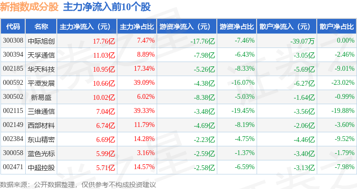 资金流向方面,新指数(399100)成份股当日主力资金净流出合计372.88亿元,游资资金净流出合计24.22亿元,散户资金净流入合计397.1亿元。成份股资金流向详情见下表: