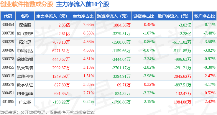 资金流向方面,创业软件(399264)指数成份股当日主力资金净流出合计28.38亿元,游资资金净流入合计10.17亿元,散户资金净流入合计18.21亿元。成份股资金流向详情见下表: