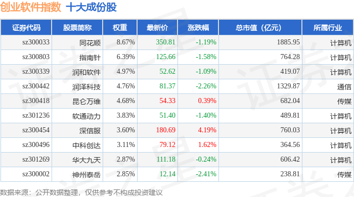 创业软件(399264)指数十大成份股详情如下: