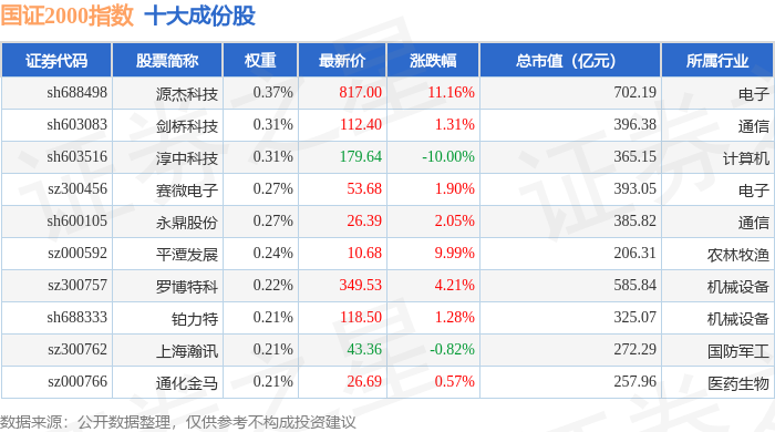 证券之星消息,1月27日,国证2000(399303)指数报收于11058.56点,涨0.34%,成交9178.76亿元,换手率4.12%。当日该指数成份股中,上涨的有769家,斯迪克以20.0%的涨幅领涨,下跌的有1205家,淳中科技以10.0%的跌幅领跌。