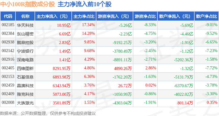 资金流向方面,中小100R(399333)指数成份股当日主力资金净流出合计50.28亿元,游资资金净流入合计5.99亿元,散户资金净流入合计44.29亿元。成份股资金流向详情见下表: