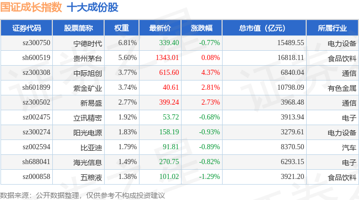国证成长(399370)指数十大成份股详情如下: