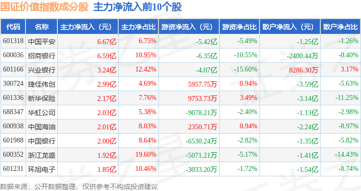 资金流向方面,国证价值(399371)指数成份股当日主力资金净流出合计66.11亿元,游资资金净流入合计24.25亿元,散户资金净流入合计41.86亿元。成份股资金流向详情见下表: