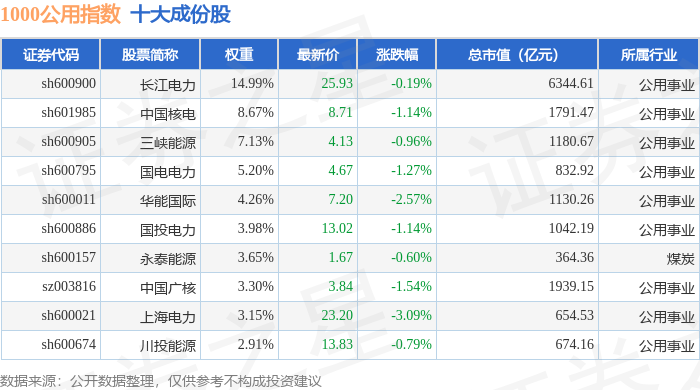 1000公用(399390)指数十大成份股详情如下: