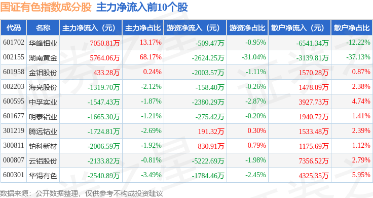 资金流向方面,国证有色(399395)指数成份股当日主力资金净流出合计102.13亿元,游资资金净流入合计19.25亿元,散户资金净流入合计82.88亿元。成份股资金流向详情见下表: