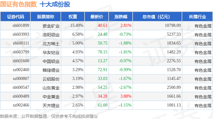 国证有色(399395)指数十大成份股详情如下: