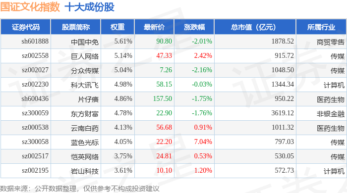 证券之星消息,1月27日,国证文化(399397)指数报收于2601.85点,涨0.4%,成交876.63亿元,换手率4.63%。当日该指数成份股中,上涨的有17家,蓝色光标以7.04%的涨幅领涨,下跌的有32家,光环新网以3.07%的跌幅领跌。