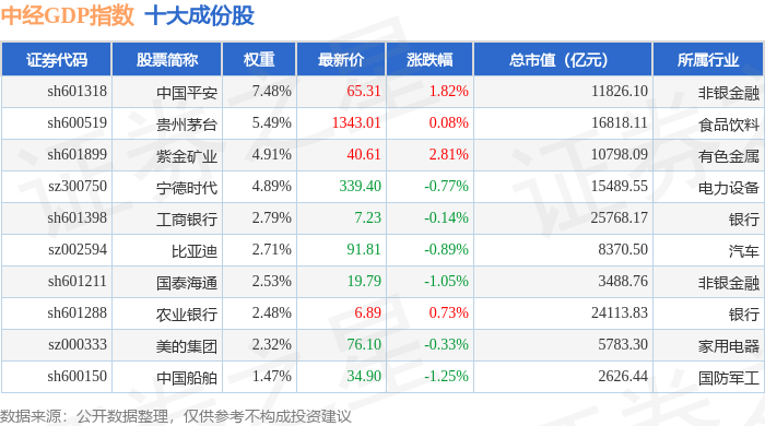 中经GDP(399399)指数十大成份股详情如下: