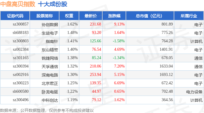 证券之星消息,1月27日,中盘高贝(399407)指数报收于3567.91点,涨1.09%,成交2478.42亿元,换手率4.1%。当日该指数成份股中,上涨的有60家,盛科通信以20.0%的涨幅领涨,下跌的有40家,智飞生物以6.1%的跌幅领跌。