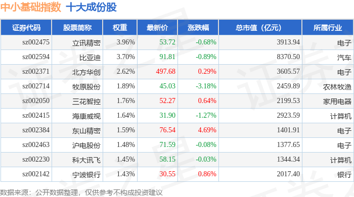 中小基础(399623)指数十大成份股详情如下: