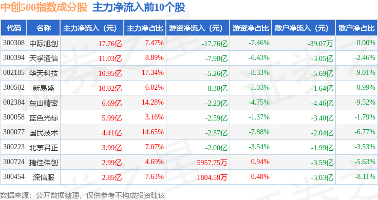 资金流向方面,中创500(399625)指数成份股当日主力资金净流出合计127.63亿元,游资资金净流出合计4.54亿元,散户资金净流入合计132.17亿元。成份股资金流向详情见下表:
