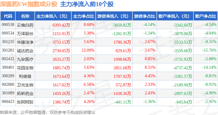 资金流向方面,深医药EW(399676)指数成份股当日主力资金净流出合计45.61亿元,游资资金净流入合计16.12亿元,散户资金净流入合计29.5亿元。成份股资金流向详情见下表: