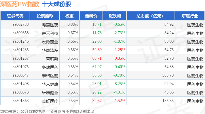 深医药EW(399676)指数十大成份股详情如下: