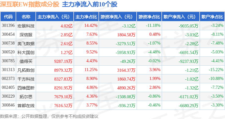 资金流向方面,深互联EW(399677)指数成份股当日主力资金净流出合计34.86亿元,游资资金净流入合计6.85亿元,散户资金净流入合计28.02亿元。成份股资金流向详情见下表: