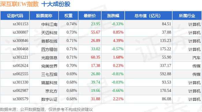 证券之星消息,1月27日,深互联EW(399677)指数报收于6283.77点,涨0.08%,成交1168.24亿元,换手率5.19%。当日该指数成份股中,上涨的有65家,宏景科技以20.0%的涨幅领涨,下跌的有99家,盈建科以5.82%的跌幅领跌。
