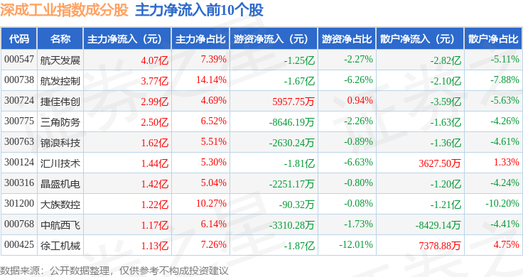 资金流向方面,深成工业(399682)指数成份股当日主力资金净流出合计31.25亿元,游资资金净流入合计2.08亿元,散户资金净流入合计29.17亿元。成份股资金流向详情见下表: