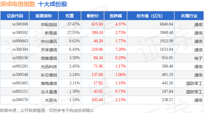 证券之星消息,1月27日,深成电信(399688)指数报收于6835.98点,涨3.25%,成交896.48亿元,换手率5.67%。当日该指数成份股中,上涨的有15家,中瓷电子以10.0%的涨幅领涨,下跌的有2家,锐捷网络以1.34%的跌幅领跌。