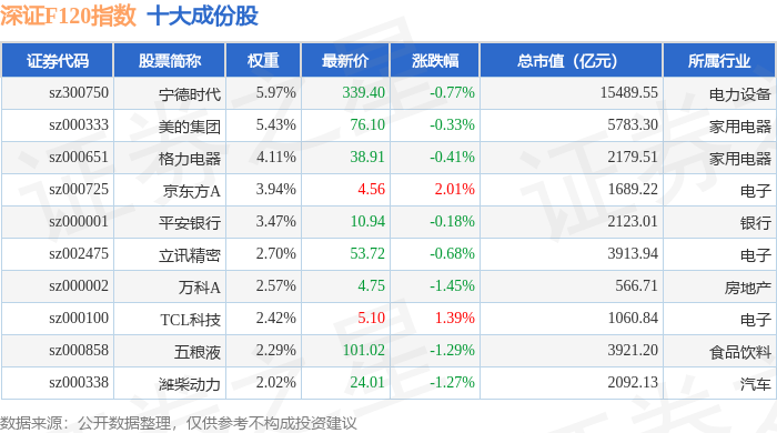 证券之星消息,1月27日,深证F120(399702)指数报收于7894.77点,跌0.75%,成交2009.74亿元,换手率1.68%。当日该指数成份股中,上涨的有24家,鹏鼎控股以5.97%的涨幅领涨,下跌的有95家,越秀资本以8.21%的跌幅领跌。