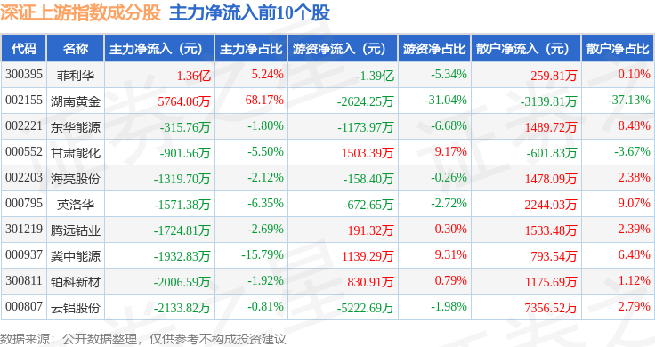 资金流向方面,深证上游(399704)指数成份股当日主力资金净流出合计86.65亿元,游资资金净流入合计12.27亿元,散户资金净流入合计74.37亿元。成份股资金流向详情见下表: