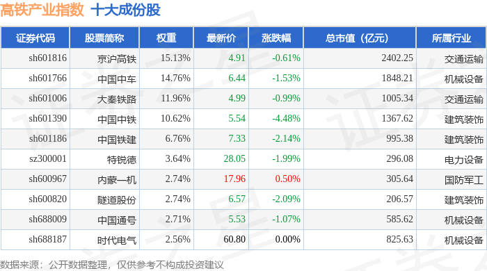 高铁产业(399807)指数十大成份股详情如下:
