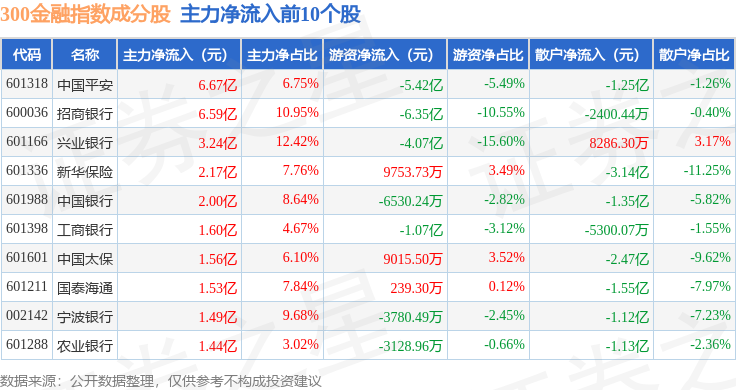 资金流向方面,300金融(399914)指数成份股当日主力资金净流入合计17.9亿元,游资资金净流出合计6.96亿元,散户资金净流出合计10.95亿元。成份股资金流向详情见下表:
