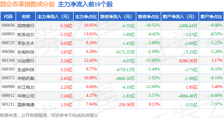 资金流向方面,国企改革(399974)指数成份股当日主力资金净流出合计35.54亿元,游资资金净流入合计7797.11万元,散户资金净流入合计34.76亿元。成份股资金流向详情见下表: