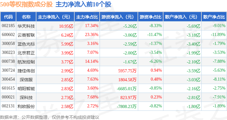 资金流向方面,500等权(399982)指数成份股当日主力资金净流出合计143.58亿元,游资资金净流入合计11.09亿元,散户资金净流入合计132.48亿元。成份股资金流向详情见下表: