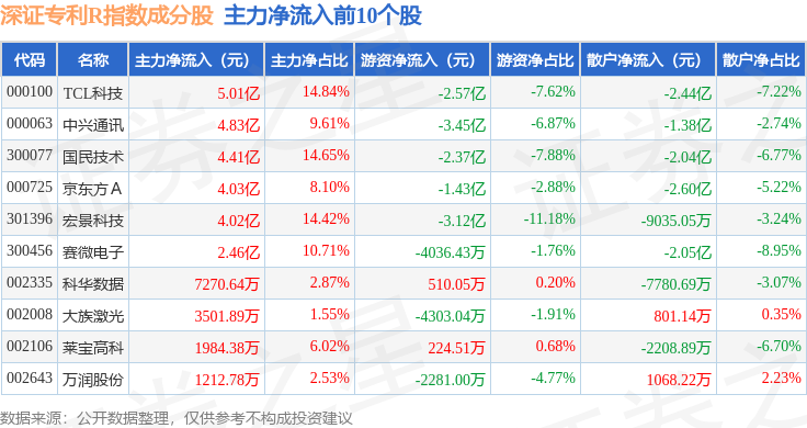 资金流向方面,深证专利R(470067)指数成份股当日主力资金净流出合计17.94亿元,游资资金净流出合计5.02亿元,散户资金净流入合计22.96亿元。成份股资金流向详情见下表: