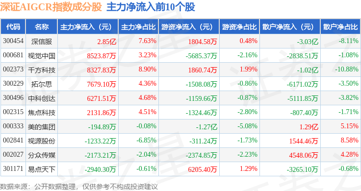 资金流向方面,深证AIGCR(470075)指数成份股当日主力资金净流出合计34.94亿元,游资资金净流入合计11.13亿元,散户资金净流入合计23.81亿元。成份股资金流向详情见下表: