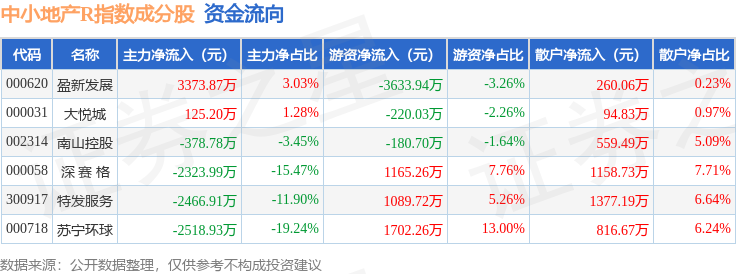 资金流向方面,中小地产R(471002)指数成份股当日主力资金净流出合计4189.54万元,游资资金净流出合计77.43万元,散户资金净流入合计4266.97万元。成份股资金流向详情见下表:
