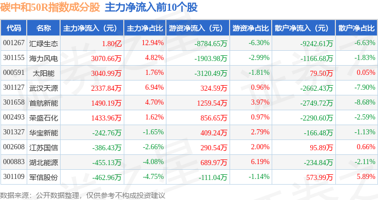 资金流向方面,碳中和50R(480021)指数成份股当日主力资金净流出合计47.54亿元,游资资金净流入合计10.05亿元,散户资金净流入合计37.48亿元。成份股资金流向详情见下表: