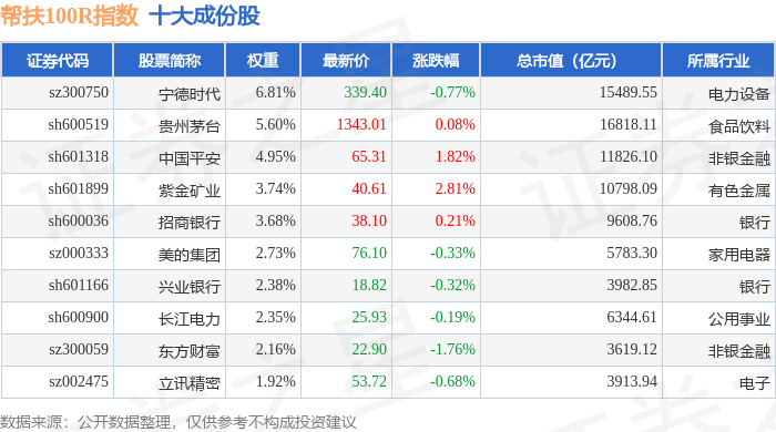 帮扶100R(480065)指数十大成份股详情如下: