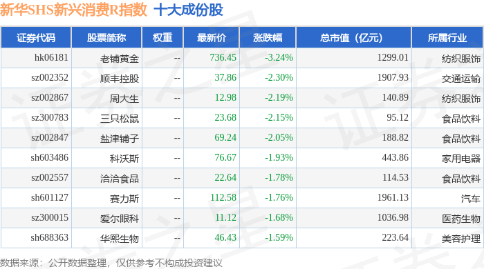 新华SHS新兴消费R(489006)指数十大成份股详情如下: