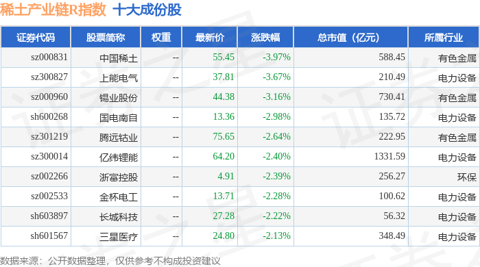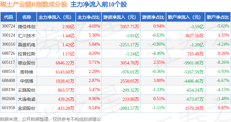 资金流向方面,稀土产业链R(489013)指数成份股当日主力资金净流出合计50.97亿元,游资资金净流入合计12.22亿元,散户资金净流入合计38.74亿元。成份股资金流向详情见下表: