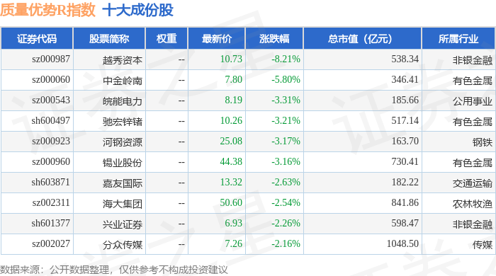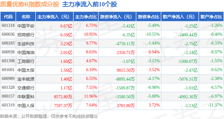 资金流向方面,质量优势R(489017)指数成份股当日主力资金净流出合计20.21亿元,游资资金净流入合计2.57亿元,散户资金净流入合计17.64亿元。成份股资金流向详情见下表: