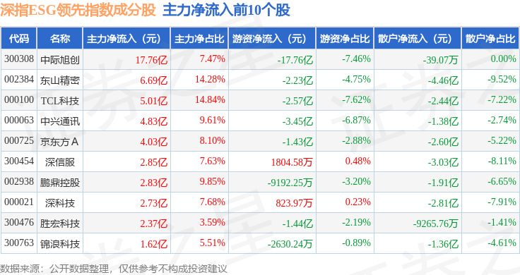 资金流向方面,深指ESG领先(970029)指数成份股当日主力资金净流出合计90.58亿元,游资资金净流出合计3.62亿元,散户资金净流入合计94.2亿元。成份股资金流向详情见下表: