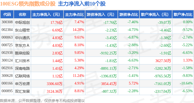 资金流向方面,100ESG领先(970030)指数成份股当日主力资金净流出合计20.53亿元,游资资金净流出合计16.49亿元,散户资金净流入合计37.02亿元。成份股资金流向详情见下表: