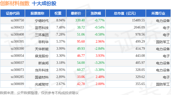 证券之星消息,1月27日,创新材料(970039)指数报收于5830.81点,涨0.3%,成交667.64亿元,换手率4.41%。当日该指数成份股中,上涨的有23家,三角防务以11.15%的涨幅领涨,下跌的有27家,鹏辉能源以4.73%的跌幅领跌。