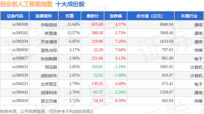 创业板人工智能(970070)指数十大成份股详情如下: