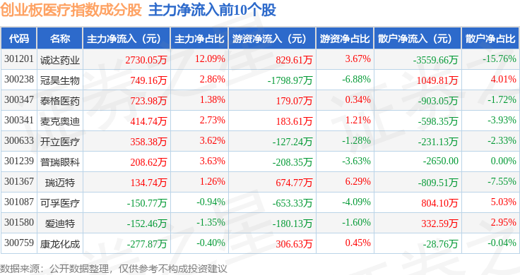 资金流向方面,创业板医疗(970082)指数成份股当日主力资金净流出合计11.6亿元,游资资金净流入合计2.74亿元,散户资金净流入合计8.86亿元。成份股资金流向详情见下表: