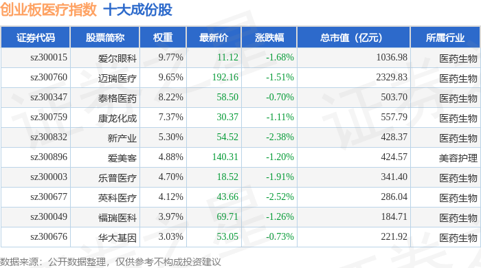 创业板医疗(970082)指数十大成份股详情如下: