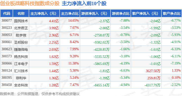 资金流向方面,创业板战略科技(971004)指数成份股当日主力资金净流入合计8.45亿元,游资资金净流出合计9.06亿元,散户资金净流入合计6064.06万元。成份股资金流向详情见下表: