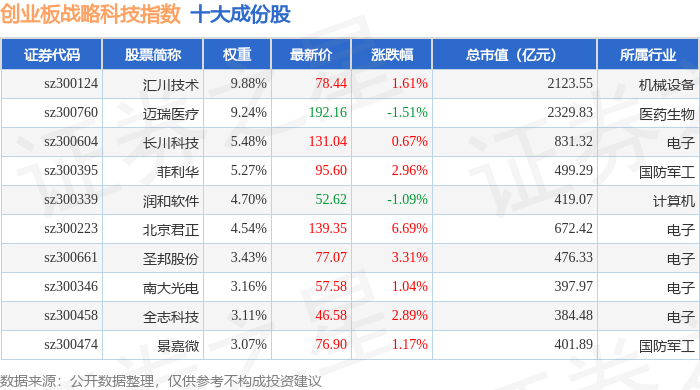 创业板战略科技(971004)指数十大成份股详情如下: