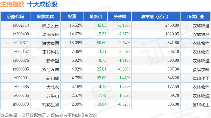 生猪指数(980073)十大成份股详情如下: