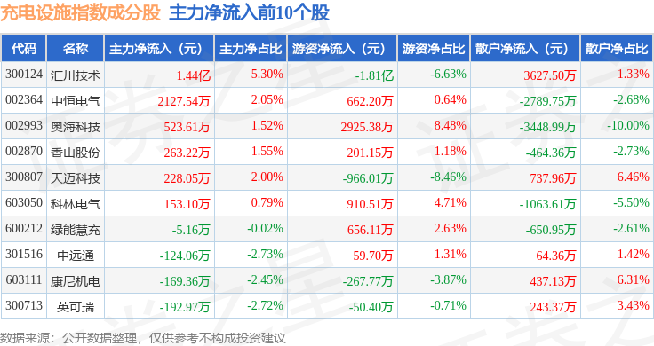 资金流向方面,充电设施(980077)指数成份股当日主力资金净流出合计14.23亿元,游资资金净流出合计3.52亿元,散户资金净流入合计17.5亿元。成份股资金流向详情见下表: