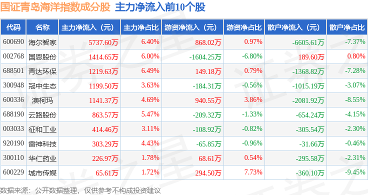 资金流向方面,国证青岛海洋(980532)指数成份股当日主力资金净流出合计3.17亿元,游资资金净流入合计1.43亿元,散户资金净流入合计1.74亿元。成份股资金流向详情见下表:
