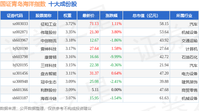国证青岛海洋(980532)指数十大成份股详情如下: