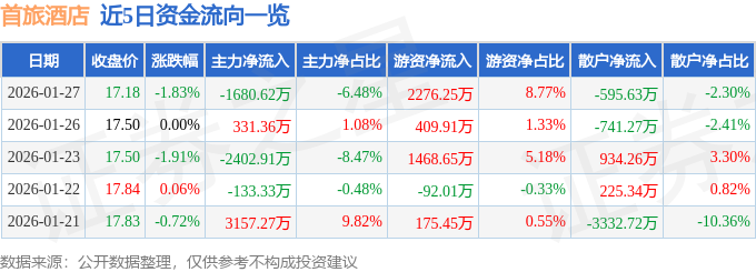 证券之星消息,截至2026年1月27日收盘,首旅酒店(600258)报收于17.18元,下跌1.83%,换手率1.36%,成交量15.13万手,成交额2.59亿元。